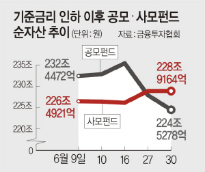 하지만 고액자산가들은 한 푼이라도 더 수익을 끌어올리려고 위험자산에 더욱 공격적인 투자 행보를 보이고 있다. 최소 가입금액 1억 원 이상으로 투자자가 제한돼 ‘그들만의 리그’로 불리는 사모펀드 규모는 기준금리 인하 영향으로 사상 처음 공모펀드를 넘어섰다. 하이일드펀드 등 주로 고위험 자산에 투자하는 사모펀드 순자산 총액은 6월 27일 기준 229조 원으로 공모펀드(228조 원)를 뛰어넘었다. 또 연 4∼8%의 고수익을 제공하는 상업용 부동산 등에 투자하는 부동산 펀드가 고액자산가들의 재테크 수단으로 주목받고 있다. 6월 말 기준 부동산 펀드 규모는 38조9283억 원으로 반년 전인 지난해 말보다 11.4%(3조9897억 원)나 증가했다.