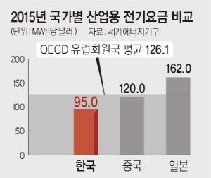 11일 국제에너지기구(IEA) 등에 따르면 2015년 기준 우리나라 산업용 전기요금은 95.0달러/㎿h로 경제협력개발기구(OECD) 평균(104.8 달러/㎿h)은 물론, 일본(162달러/㎿h)·중국(120달러/㎿h)·OECD 유럽 회원국 평균(126.1 달러/㎿h) 등에 비해 저렴한 것으로 나타났다.