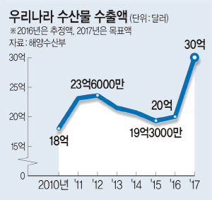 해수부 관계자는 “수출단가가 높은 활어와 신선 냉장식품, 프리미엄 가공식품 수출 비중을 55% 이상으로 끌어올려 2017년까지 수산물 수출을 30억 달러로 늘릴 계획”이라고 말했다.