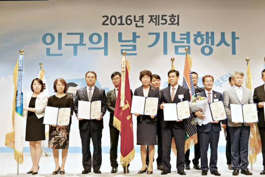 노일식(왼쪽 세 번째) 롯데리아 대표이사 등이 보건복지부 주최로 11일 서울 서초구 양재동 AT센터에서 열린 ‘2016년 제5회 인구의 날 기념식’에서 일-가정 양립에 이바지한 공로로 대통령 표창을 받은 뒤 기념 촬영하고 있다.