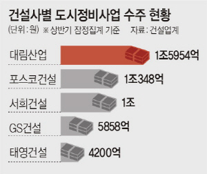 대형건설사 중에서는 대림산업이 1조5954억 원을 수주, 1위에 올랐다. 대림산업은 상반기 공격적인 수주 행보를 보이며 인천 청천2구역(7528억 원), 경기 김포 북변5구역(3765억 원) 등 6개 재개발·재건축 사업을 따냈다. 이어 포스코건설도 총 1조348억 원의 도시정비사업을 수주해 상반기에 수주 실적 1조 클럽에 가입했다. 또 SK건설도 8387억 원의 도시정비사업을 수주해 선전했다.
