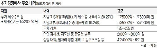정부의 추경 재원은 1조2000억 원의 세계잉여금(지난해 초과 세입과 세출 불용액의 합계)과 올해 예상보다 더 걷힐 것으로 추정되는 세수(초과 세수) 약 9조 원 등으로 구성될 것으로 예상된다.