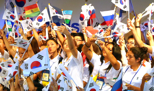 13일 오전 부산 동구 부산항국제여객터미널 컨벤션센터 5층 콘퍼런스홀에서 열린 ‘2016 재외동포 청소년 초청 연수’ 개막식 참가자들이 태극기를 흔들고 있다.