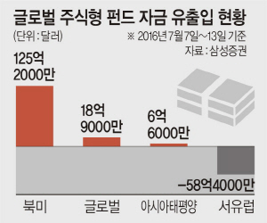 미국 주식형 펀드로 지난주 125억(약 14조 원) 달러가 유입돼 지난해 9월 이후 최대치를 기록한 반면, 브렉시트 이후 유럽에서는 3주 동안 156억 달러가 썰물처럼 빠져나갔다.