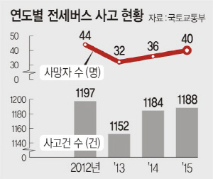 교통안전공단에 따르면 전세버스는 5월 말 현재 전국 1954개 업체에서 4만6963대를 운행하며, 매년 약 1200건의 사고로 40명 정도가 숨지고 3000명 가까이 중경상을 당한다. 공단이 지난해 전세버스 교통사고의 원인을 분석한 결과, 총 1188건 가운데 전방주시 태만 등 ‘안전운전 의무 불이행’이 626건으로 가장 많았다.