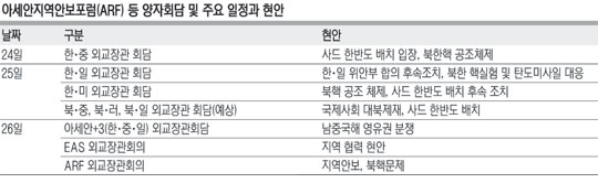 윤 장관은 25일 일본 기시다 후미오(岸田文雄) 외무상과의 양자회담에 이어 미국 존 케리 국무장관과 회담을 하고 사드가 중국을 겨냥한 것이 아니며 북핵 위협에 대응한 방어조치라는 메시지를 발신하는 데 주력할 계획이다. 남중국해 중재재판 결과에 대해서도 한국은 최대한 가치판단을 배제한 채 중국을 자극하지 않으려고 할 것으로 보인다.