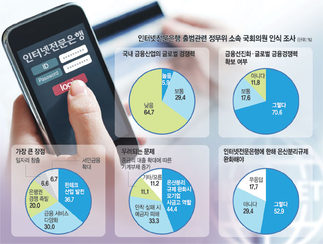 20대 국회 정무위원회 소속 국회의원 10명 중 7명은 인터넷전문은행이 시중은행의 경쟁을 촉발해 국내 금융산업의 경쟁력을 높일 것으로 판단하는 것으로 나타났다. 인터넷전문은행 출범에 따른 긍정적 영향으로는 ‘핀테크(Fintech·기술+금융) 산업 발전’을 가장 많이 꼽았다. 문화일보는 지난 18일부터 25일까지 정무위 소속 여야 의원 24명을 대상으로 ‘인터넷전문은행 인식 설문조사’를 실시했으며, 새누리당 8명, 더불어민주당 7명, 국민의당 1명, 정의당 1명 등 총 17명이 설문에 응답했다. 나머지 의원은 인터넷은행과 관련된 은행법 개정안에 대한 입장을 정리하지 못했다는 이유 등으로 설문에 응하지 않았다.