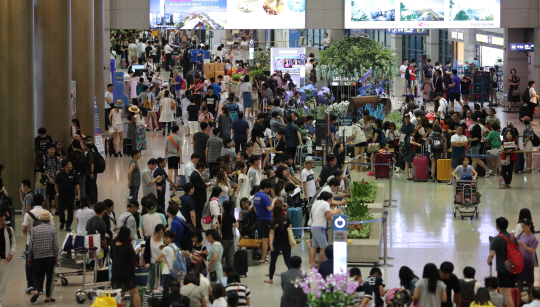 올해 상반기 항공여객 수가 지난해보다 14.5% 증가한 4980만 명으로 역대 최고치를 경신한 가운데 27일 인천공항 입국장이 여행객들로 붐비고 있다.