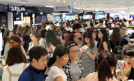 1일 서울 중구 소공동 롯데면세점에 유커(중국인 관광객) 등 외국인 관광객이 몰려 북새통을 이루고 있다. 올 상반기 국내 면세점 매출액은 유커 증가와 지난해 발생한 메르스(중동호흡기증후군)사태 기저 효과에 따라 전년대비 26% 이상 늘어났다.