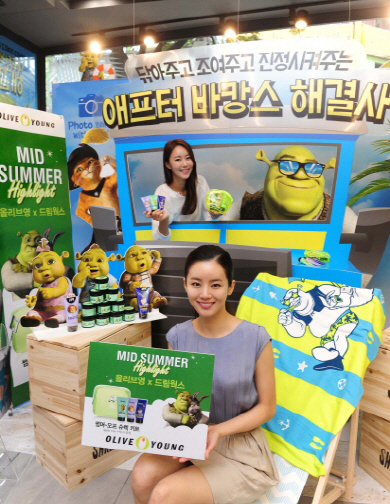 CJ올리브네트웍스가 운영하는 헬스 앤 뷰티스토어 올리브영에서 한 모델이 1일 드림웍스 ‘슈렉’ 캐릭터와 함께하는 애프터 바캉스 케어 프로모션을 홍보하고 있다. 올리브영은 8월 한 달 간 이 프로모션을 실시한다.