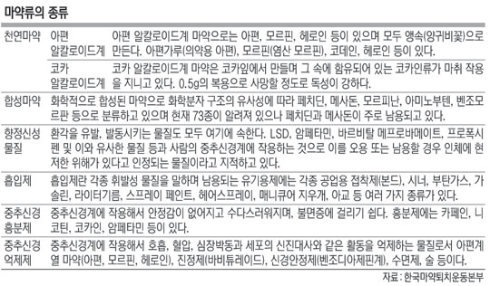 ◇중독성 강한 마약류 = 마약이란 모르핀과 코카인, 아편 등과 그 유도체로서 미량으로 강력한 진통작용과 마취작용을 지니며 계속 사용하면 습관성과 탐닉성이 생기게 되는 물질이다. 사용을 중단하면 격렬한 금단증세를 일으켜 마약을 사용하지 않고는 정상적인 생활을 할 수 없게 되며, 결국 육체적으로나 정신적으로 폐인이 된다. 이런 물질이 의료 및 연구 이외의 목적에 남용되는 위험을 방지하기 위해 정한 법률상 용어가 ‘마약’이다. 세계보건기구(WHO)는 마약류를 약물사용에 대한 욕구가 강제적일 정도로 강하고 사용 약물의 양이 증가하는 경향이 있으며, 금단현상 등이 나타나고 개인에 한정되지 않고 사회 전반에 해를 끼치는 약물로 정의하고 있다.