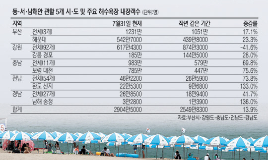 부산 3개 해수욕장 내장객은 17.1% 증가했고, 경남지역 27개 해수욕장도 41.7% 늘었다. 전남도내 54개 해수욕 피서객은 무려 73.8% 증가했다. 반면 강원도내 92개 해수욕장 피서객은 41.6%나 감소했다.