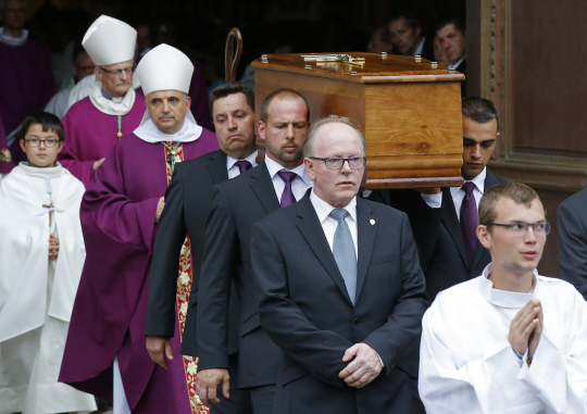 지난달 26일 프랑스 북부 루앙시의 성당에 난입한 수니파 무장세력 이슬람국가(IS) 테러범 2명에게 살해당한 자크 아멜 신부의 장례식이 2일 거행된 가운데, 참석자들이 아멜 신부의 관을 옮기고 있다.