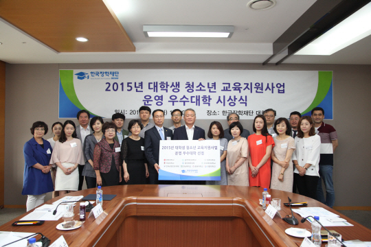 한국장학재단은 4일 ‘2015년 대학생 청소년 교육지원사업 우수대학’으로 10개 대학을 선정했다고 밝혔다. 경북대·광주여대·동아대·서강대·영진전문대·이화여대·인하공업전문대·전남대·충북대·한밭대 등이다. 시상식은 지난 2일 서울 중구 남대문로 재단 서울사무소에서 진행됐다. 대학생 청소년 교육지원사업은 저소득가정 청소년을 대상으로 대학생이 학습지도, 특별활동, 상담 등 멘토링 활동을 하면서 국가근로장학금을 지원받는 사업이다. 지난 2012년부터 현재까지 대학생 멘토 6만9433명, 청소년 멘티 17만6264명이 참여하고 있다. 재단은 지난해 사업에 참여했던 162개 대학을 대상으로 1차 심사를 통해 52개 대학을 선정한 뒤, 2차 심사를 통해 최종 10개 대학을 뽑았다.