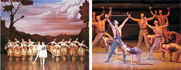 유니버설발레단은 우아하고 여성미 넘치는 ‘지젤’(왼쪽 사진)을, 국립발레단은 박력과 남성미 가득한 ‘스파르타쿠스’(오른쪽)를 선보인다. 상반된 매력의 두 공연은 무더위를 식히는 ‘극과 극’ 발레 체험이 될 것으로 보인다.