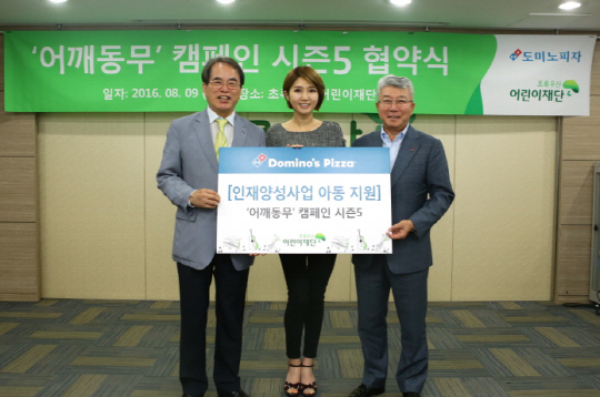 오광현(오른쪽) 도미노피자 회장은 9일 서울 중구 무교로 초록우산어린이재단에서 이제훈(왼쪽) 재단 회장, 김경란 홍보대사와 학업, 예술, 체육 등의 분야에 재능이 있지만 경제적 여건으로 꿈을 키우기 어려운 아동을 돕기 위한 ‘어깨동무 캠페인 시즌 5’ 협약을 체결했다.