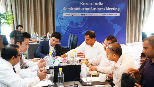 산업통상자원부와 한국반도체산업협회가 22일 인도 뉴델리에서 개최한 인도 반도체 시장개척단 수출상담회에서 우리나라 업체 관계자가 현지 바이어를 상대로 사업을 설명하고 있다.