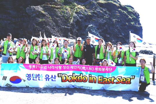 성신여대(총장 심화진) 체인지(體人知) 사회봉사단 23명은 광복 71돌을 맞아 지난 18∼20일 ‘영원한 유산 Dokdo in East Sea’를 주제로 독도 역사문화탐방행사를 하고 독도 경비대에 요가 매트 및 스포츠 타월 등 위문품을 전달했다.