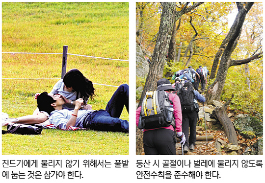 ◇진드기 매개 질병 특히 주의 = 가을철 야외활동에서 가장 주의해야 할 질환은 쓰쓰가무시병이다. 진드기를 매개로 한 대표 질환이다. 시기적으로는 늦봄과 여름철에 진드기가 늘어나는 것으로 알려졌지만, 야외활동이 많은 가을에 감염위험이 더 높다.