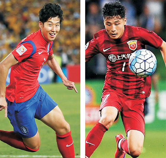 다음 달 1일 서울월드컵경기장에서 펼쳐질 한국-중국의 2018 러시아월드컵 아시아지역 최종예선 1차전은 창과 창의 대결이 될 전망이다. 특히 측면 공격수인 손흥민(24·토트넘 홋스퍼·왼쪽 사진)과 우레이(25·상하이 상강·오른쪽)의 힘겨루기에 따라 희비가 엇갈릴 것으로 내다보인다.