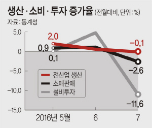 승용차 개별소비세 인하가 종료되면서 7월 생산, 소비, 투자가 전월대비 일제히 마이너스로 돌아섰다. 미국의 본격적인 금리인상 가능성 등 대외 리스크(위험)가 커지는 상황에서 한국 경제가 내우외환의 위기에 빠져들고 있다는 경고의 목소리가 커지고 있다.