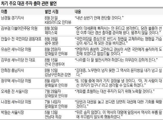 대선을 16개월이나 남긴 상황에서 대권 주자들이 조기 대권 경쟁 선언에 나선 것은 과거와 같은 카리스마 지도력이나 절대 강자가 없는 정치판에서 일종의 선점 효과를 노린 것으로 보인다. 대선 후보군에 대한 평가가 오가는 추석 밥상에 이름을 올리려는 선제적인 움직임으로도 해석된다.