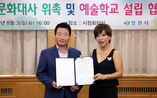 안상수(왼쪽) 창원시장과 조 씨는 30일 오후 시청에서 학생들의 잠재적 능력과 소질을 계발하고 지덕체(智德體)를 겸비한 예술전문인을 양성하기 위한 ‘예술학교 설립 협약’을 체결했다. 협약에서 시와 조 씨는 예술교육의 기회를 확대하고 예술적 재능이 우수한 학생들이 예술인으로 성장할 수 있도록 학교 설립에 협력하기로 했다. 양측은 학교 위치, 규모, 개교시기, 교육과정 등 창원지역에 필요한 예술학교 설립방안을 마련하고, 교육부 및 경남도교육청과 협의해 조기에 학교가 건립될 수 있도록 다각적인 노력을 기울이기로 했다.