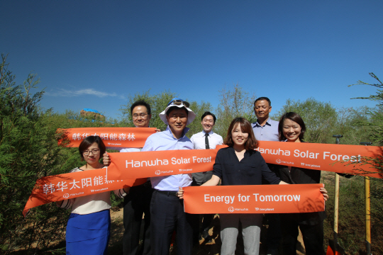 한화그룹은 1일 중국 닝샤(寧夏)자치구 마오쓰 사막에서 한화그룹 커뮤니케이션팀 최선목 부사장과 한화차이나 김영락 상무 등 임직원과 닝샤자치구 고위 관계자들이 참석한 가운데 ‘한화 태양의 숲 6호(한화 쏠라 포레스트)’ 조성행사(사진)를 가졌다.