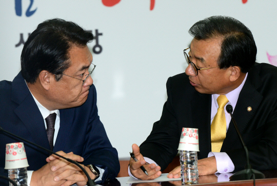 8일 오전 여의동 새누리당사에서 열린 최고위원회의에서 이정현(오른쪽) 대표가 정치 현안에 대한 자신의 입장을 밝히자 정진석 원내대표가 심각한 표정을 짓고 있다.