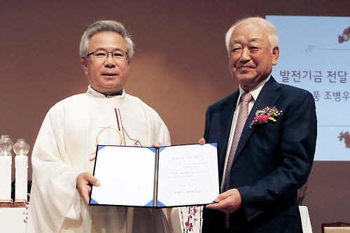 모자전문기업 ㈜유풍의 조병우(오른쪽) 회장은 8일 경기 부천시 가톨릭대에서 박영식 총장에게 발전기금 10억 원을 전달했다. 가톨릭대는 조 회장이 그동안 전국 20여 곳의 복지시설과 제3세계 국가의 어려운 이웃을 지원해왔다고 밝혔다.