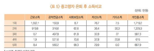 보고서에 따르면 2006년 이후 은퇴한 사람들의 소득 평균은 2006년 연 1천719만원에서 2008년 1천329만원, 2010년 587만원으로 급감했다. 은퇴 4년 만에 소득이 은퇴 전의 34%에 불과한 수준으로 줄어든 것이다.