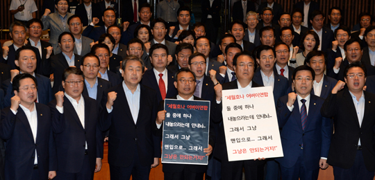 새누리당 이정현(앞줄 가운데)대표 등 당직자와 의원들이 26일 오전 국회예산결산위원회 회의실에서 의원총회를 마친 뒤 정세균 국회의장과 야당을 비판하는 피켓을 들고 구호를 외치고 있다.