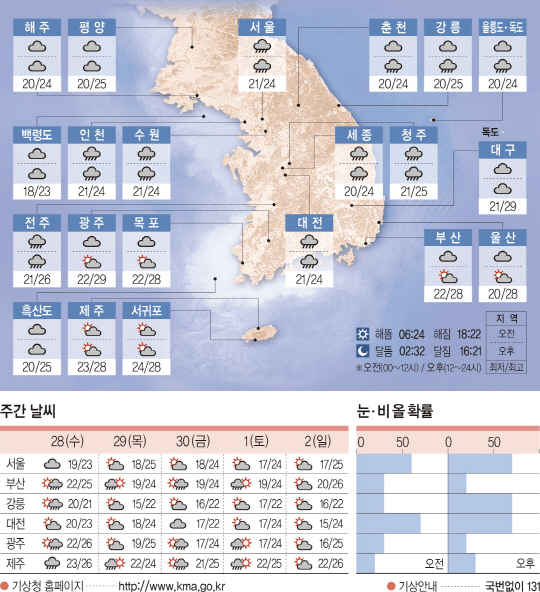 27일 전국이 흐리고 새벽에 중부 서해안과 전북에서 비(강수확률 60~80%)가 시작돼 그 밖의 중부와 경북으로 차차 확대되겠다. 아침 최저기온은 17도에서 23도, 낮 최고기온은 24도에서 30도가 되겠다.