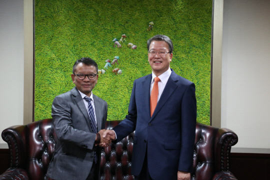 임환수(오른쪽) 국세청장이 19일 인도네시아 자카르타에서 열린 ‘제6차 양국 국세청장 회의’에 앞서 켄 드위주기아스테아디 인도네시아 국세청장과 악수하고 있다. 임 청장은 우리나라 진출기업에 대한 적극적인 세정 지원을 당부했다.