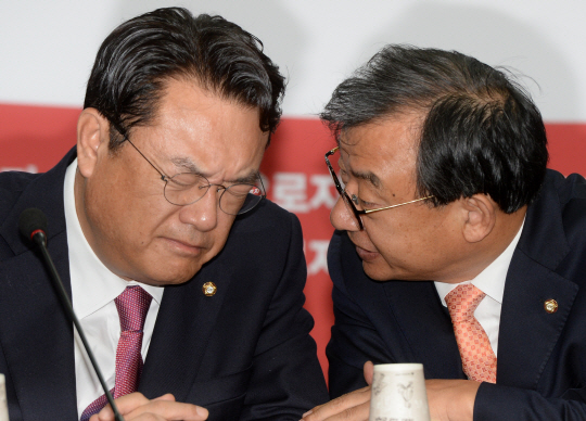 27일 오전 여의도 새누리당사에서 열린 최고위원회의에서 이정현(오른쪽) 대표가 잔뜩 인상을 쓰고 있는 정진석 원내대표에게 귀엣말을 하고 있다.
