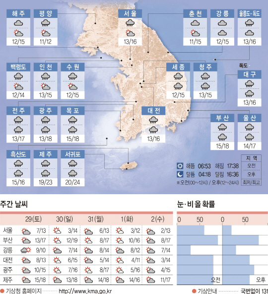 전국이 흐리고 서울·경기와 강원은 아침 한때, 그 밖의 지역은 늦은 오후까지 비(강수확률 60∼90%)가 오는 곳이 있겠다. 한편, 동풍의 영향으로 강원 동해안은 늦은 밤에 비(강수확률 60%)가 오는 곳이 있겠다. 아침 최저기온은 10도에서 16도, 낮 최고기온은 14도에서 20도가 되겠다.