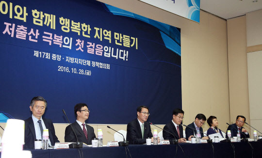 “저출산을 막아라!” 전국 출산율을 높이기 위한 중앙과 지방의 공조가 본격화한다. 행정자치부는 28일 부산 벡스코 제2전시장에서 ‘제17회 중앙·지방 정책협의회’를 개최한다고 밝혔다. 김성렬 행자부 차관 주재로 진행된 이날 회의(사진)에는 보건복지부 인구정책실장과 17개 시도의 부단체장들이 총출동했다. 전국적으로 저출산 문제가 심각해지면서 지난해 12월 ‘3차 저출산 대책’이 나온 이래 복지부까지 나서 지자체와 함께 대책을 논의하기는 이번이 처음이다.