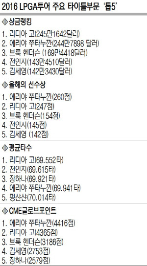 올해의 선수상 포인트는 우승자에게는 30점이 주어지며, 10위 밖으로 밀려나면 점수를 받지 못한다. CME 글로브 포인트는 우승자에게 500점, 2위 300점 등 순위에 따라 점수가 차등 부여되고 마지막 투어챔피언십에서 점수를 다시 매기기 때문에 마지막 대회에서 판가름이 날 것으로 전망된다. 전인지는 올해의 선수 3위, 상금 4위. 김세영(23)은 올해의 선수 4위, CME 글로브 포인트 4위, 상금 5위다. 장하나 (24)는 최저타수 4위를 달리고 있다. 4일부터 사흘간 일본 이바라키현 다이헤이요 골프장 미노리 코스(파72)에서 열리는 토토 재팬 클래식(총상금 150만 달러)은 주요 타이틀 경쟁의 분수령이 될 것으로 전망된다. 리디아 고와 쭈타누깐, 그리고 전인지가 모두 출전하기 때문이다.