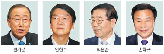 이들 중 반 총장을 제외한 세 명은 북한 핵 문제와 관련, 대북 제재와 대화를 병행해야 한다는 입장이다. 반 총장은 지난 5월 제주포럼 기조연설에서 “북한과 대화의 길을 다시 찾아야 한다”고 말했다. 하지만 이후 “대화를 목적으로 한 제재가 필요하다”고 밝히면서 ‘선제재 후대화’의 뜻을 분명히 했다. 반면 안 전 대표는 6월 국회 교섭단체대표 연설에서 “외부의 제재와 압박만으로 한 체제가 붕괴한 전례는 없다”며 “평화통일의 과정을 만들어가기 위해 대화와 협력이 필요하다”고 했다.
