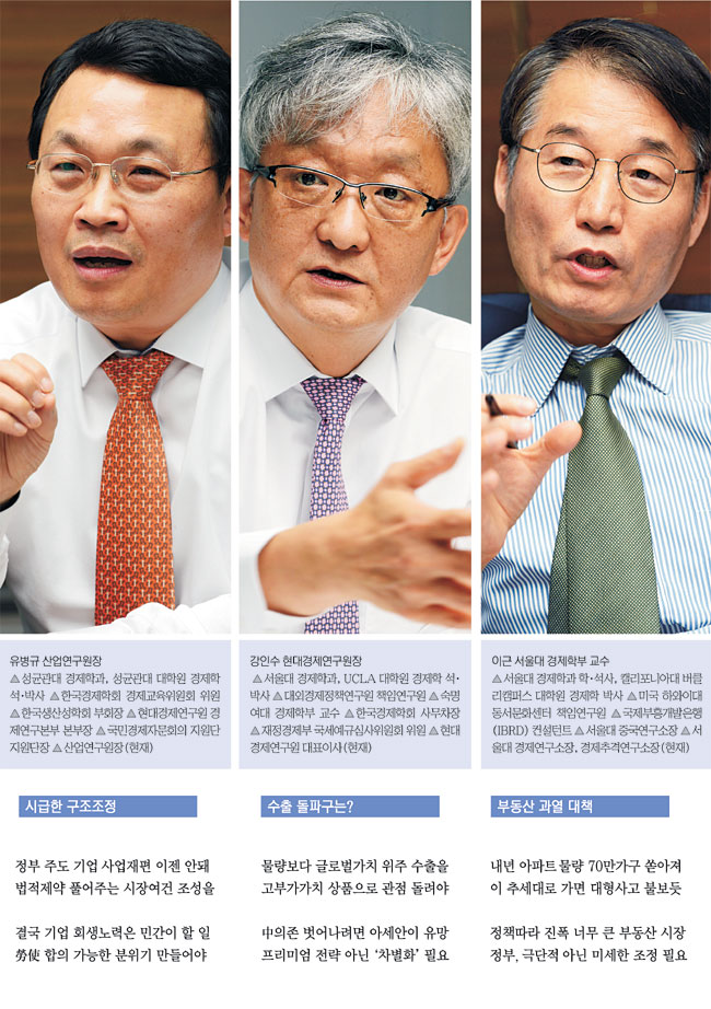 한국 경제를 둘러싼 대내외 환경이 악화일로다. 안으로는 내수 침체 속에 기업 구조조정이 진행되고 있고, 밖으로는 글로벌 저성장에 따른 수출 부진으로 국내 기업들의 어려움이 가중되고 있다. 문화일보는 창간 25주년을 맞이해 이 같은 우리 경제의 대내외 리스크(위험)에 대한 진단과 함께 해법을 모색하기 위해 10월 20일 경제 전문가들을 초청해 ‘한국 경제 도전과 극복 과제’라는 주제로 특별좌담을 진행했다. 좌담에는 강인수 현대경제연구원 원장, 유병규 산업연구원 원장, 이근 서울대 경제학부 교수가 참여해 2시간여 동안 열띤 토론을 벌였다. 참석자들은 국내 경제의 위기 상황에 대한 인식을 공유하면서 우리 경제의 가장 큰 도전으로 장기 성장동력 부재 상황과 위기 극복을 위한 의지와 실천력 부재를 지목했다. 이들은 시장 논리에 따른 구조조정을 통해 경쟁력과 신성장동력을 확보하고, 기득권과 관성의 함정을 떨쳐내 정부와 기업, 노조 등이 사회적 합의를 통해 위기 극복의 힘을 모아야 한다고 주장했다. 참석자들은 또한 수출 부진 해소를 위해 아세안(동남아국가연합) 등 신흥시장 발굴과 함께 가격경쟁력 확보, 제품 차별화 전략 등으로 맞서야 한다는 데 공감했다.
