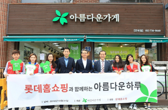 전성율(왼쪽 다섯 번째) 롯데홈쇼핑 부문장 등 임직원들이 31일 서울 종로구 재동 아름다운가게 안국점에서 특별 바자 물품 판매 자원봉사를 한 후 이동환(〃여섯 번째) 아름다운가게 상임이사 등과 기념촬영을 하고 있다. 롯데홈쇼핑은 지난 4월과 10월에 의류, 패션잡화 등 13억5000만 원 상당의 물품을 바자에 기부했다.