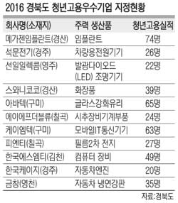 11일 도에 따르면 올해 청년 고용 우수기업은 메가젠임플란트(경산), 스와니코코(〃), 석문전기(경주), 한국케이지(〃), 선일일렉콤(영주), 아바텍(구미), 케이엠텍(〃), 에이에프더블류(칠곡), 피엔티(〃), 한국에스엠티(김천), 금창(영천) 등이다.