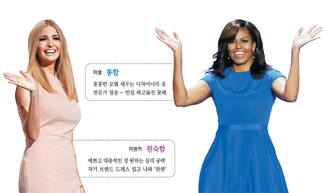 그러나 미셸의 옷은 전문가들로부터 극찬을 받았지만, 민심을 뚫고 들어가기엔 부족했다. 오히려 마음을 훔친 건 트럼프의 장녀 이방카의 드레스다. 유명 모델 출신인 이방카는 공화당 전당대회에서 자신이 운영하는 브랜드 ‘이방카 트럼프’의 연한 핑크 드레스를 입었는데, 메이시스 등 주요 백화점에서 동날 정도로 인기를 끌었다. 가격도 134달러로 저렴해 완판 기록을 남겼다. 전문가가 칭송한 패션(미셸)과 대중이 열광하는 패션(이방카)은 이번 대선 결과와도 닿아 있다. 생각할 거리가 너무 많은 옷보다는 예쁘고 대중적이며, 친근한 걸 원하는 민심을 엿볼 수 있었던 지점이다.