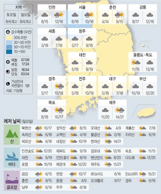 12일 전국이 대체로 맑다가 오후부터 구름이 많아지겠으나, 서울·경기와 강원은 대체로 흐리고 경기 북부와 강원 영서 북부는 밤에 비(강수확률 60∼70%)가 오는 곳이 있겠다. 서울·경기 남부는 밤에 산발적으로 빗방울이 떨어지는 곳이 있겠다. 아침 최저기온은 0도에서 10도, 낮 최고기온은 14도에서 19도가 되겠다. 13일에는 전국이 대체로 흐리고 서울·경기와 강원 영서는 아침까지, 전라와 경남·제주는 밤부터 비(강수확률 60∼70%)가 오는 곳이 있겠다. 아침 최저기온은 4도에서 12도, 낮 최고기온은 15도에서 20도가 되겠다.