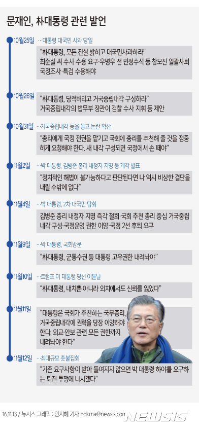 문 전 대표는 역대 최대 규모 촛불집회가 열렸던 12일에는 집회 참가자들에게 “분노의 표출은 평화적으로 이뤄져야 한다”고 자제를 요청하면서도 기존 요구사항이 받아들여지지 않으면 하야 투쟁에 나서겠다고 경고했다.