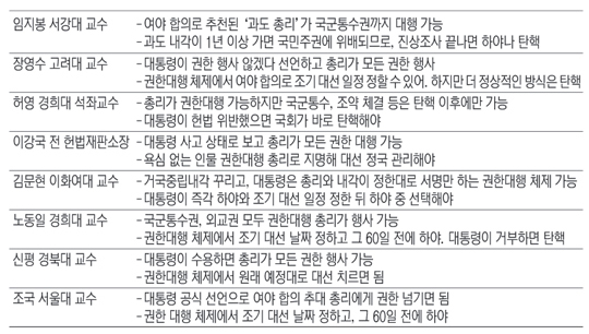 임지봉 교수, 이강국 전 헌재소장, 장영수 고려대 법학전문대학원 교수, 노동일 경희대 법학전문대학원 교수, 신평 경북대 법학전문대학원 교수 등은 모두 “대통령이 권한을 행사하지 않겠다고 선언하면 총리가 대통령의 모든 권한을 행사할 수 있다”고 말했다. 반면 허영 경희대 법학전문대학원 석좌교수는 “사고로 인한 권한 대행일 경우 대통령의 고유 권한은 박탈될 수 없다”고 봤다. 국민이 뽑지 않은 총리가 1년 넘게 국정을 운영하는 것은 무리가 있기에, 조기 대선이 불가피하다는 데는 대다수 전문가가 의견을 같이했다. 조국 서울대 법학전문대학원 교수, 노동일 교수 등은 “여야가 조기 대선 날짜를 정하고, 그 날짜를 기준으로 60일 전에 대통령이 하야하면, 국정 혼란을 줄일 수 있다”고 말했다.