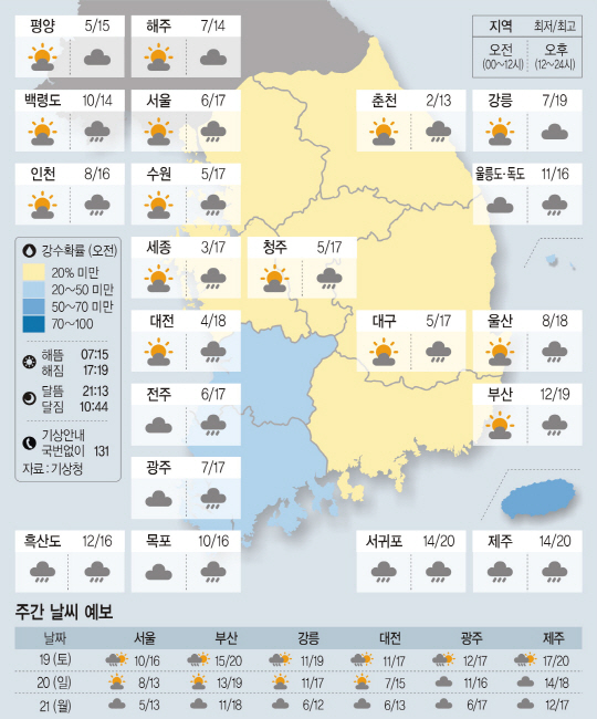 전국이 대체로 맑다가 차차 흐려져 정오 무렵 제주와 전남 해안에서 비(강수확률 60∼90%)가 시작돼 밤에는 전국 대부분 지역으로 확대되겠다. 아침 최저기온은 1도에서 12도, 낮 최고기온은 13도에서 20도가 되겠다.