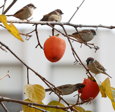 16일 오후 서울 서대문구의 한 교정에서 참새들이 순서에 맞춰 홍시를 쪼아 먹고 있다.