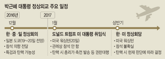 21일 여권 일각에서도 박 대통령에 대한 탄핵 추진이 속도를 내면서 정상외교가 제대로 작동되기 어렵다는 위기감이 외교안보부처에서 확산되고 있다. 국회에서 이달 중 발의가 된다면 탄핵안 의결과 동시에 대통령의 외교일정 소화도 불가능해져 박 대통령은 당장 12월 중순으로 예정된 한·중·일 정상회의에 참석하지 못한다. 헌법 제71조에 따라 대통령 권한을 대행하는 국무총리가 참석할 수도 있지만 아베 신조(安倍晋三) 일본 총리와 리커창(李克强) 중국 총리와의 북한 핵문제 등 민감한 현안 조율이 사실상 어렵다.