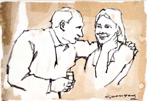 눈을 가늘게 뜬 푸틴이 옆에 앉은 러시아 미녀의 허리를 팔로 감아 안았다.